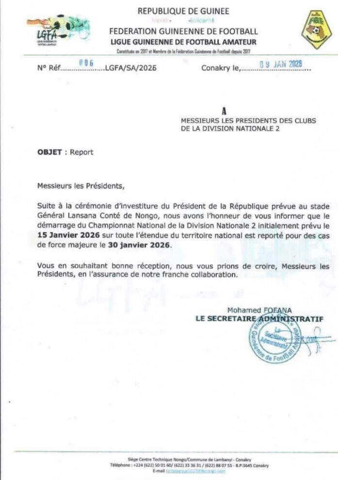 Accueil ACTUALITE INFO:Report du Championnat National 2 ACTUALITESPORT INFO:Report du Championnat National 2 Par Equipe de la Rédaction - 9 janvier 2026 147 0 Facebook Twitter Pinterest WhatsApp La Ligue Guinéenne de Football Amateur informe que le Championnat National 2, prévu pour débuter le 15 janvier 2026, est reporté au 30 janvier 2026. ARTICLES CONNEXESPLUS DE L'AUTEUR ACTUALITE Sénégal : Le journaliste Georges Déthié Diop s’éteint après la matinale de 7h à la RFM ACTUALITE Transfert de Toumba à la Maison centrale de Coyah après une opération de fouille SOCIETE Moriah Fitness : le sport rassemble Forécariah