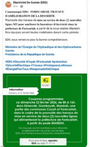EDG remercie les populations pour leur compréhension face aux désagréments occasionnés par ces travaux, qui s’inscrivent dans une dynamique d’amélioration du réseau électrique.