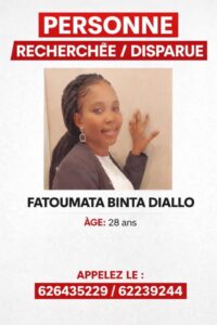Nous sommes très inquiets et lançons cet appel à l’aide pour retrouver notre petite maman, Fatoumata Binta Diallo, la petite sœur de notre mère, qui est portée disparue. Depuis sa disparition, sa famille vit dans l’angoisse et l’attend avec beaucoup d’espoir.
